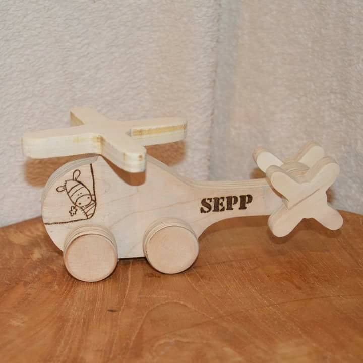 Maaikes Hobbyzolder verkoopt (in veel gevallen) handgemaakt houten speelgoed met echt draaiende delen (wielen, propellors etc.). Op deze pagina treft u slechts een selectie van mijn assortiment aan: ook het leveren van bijvoorbeeld brandweerauto's en tractors behoort tot de mogelijkheden! De vanafprijzen zijn gebaseerd op het branden van alleen een naam; aanvullende teksten en/of afbeeldingen zijn tegen meerprijs.